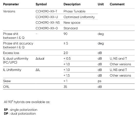 挿入損失は標準でSignal/LOともに7〜8.5 dB、偏波保持ファイバやシングルモードファイバ構成を選択でき、用途に応じた柔軟な構成が可能です。位相精度は±5°以内で、スキューは1 ps以下と高精度な干渉信号の取得に対応します。