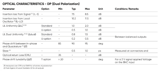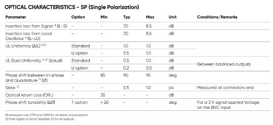 挿入損失は標準でSignal/LOともに7〜8.5 dB、偏波保持ファイバやシングルモードファイバ構成を選択でき、用途に応じた柔軟な構成が可能です。位相精度は±5°以内で、スキューは1 ps以下と高精度な干渉信号の取得に対応します。