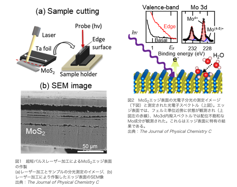 東京大学物性研究所の尾崎文彦大学院生(研究当時、現在:宇宙航空研究開発機構)、田中駿介助教(研究当時、現在:産業技術総合研究所)、𠮷信淳教授、谷峻太郎助教(研究当時、現在:理化学研究所)、小林洋平教授、松田巌教授、尾崎泰助 教授らの研究グループは、東北大学の山本達教授、京都大学の小板谷貴典准教授らとの共同研究により、レーザー加工と顕微分光を用いることで、触媒活性サイトが存在していると考えられてきた二硫化モリブデン(MoS2)のエッジ表面における電子状態と化学反応を選択的に直接観測することに成功しました。