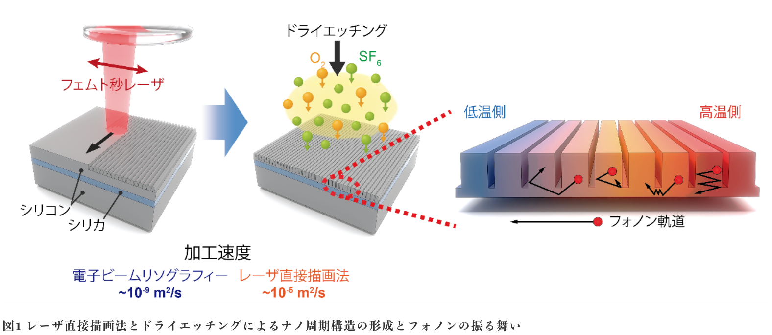 - 伝熱制御特性を持つフォノニックナノ構造を従来手法の1,000倍以上高速に作製。