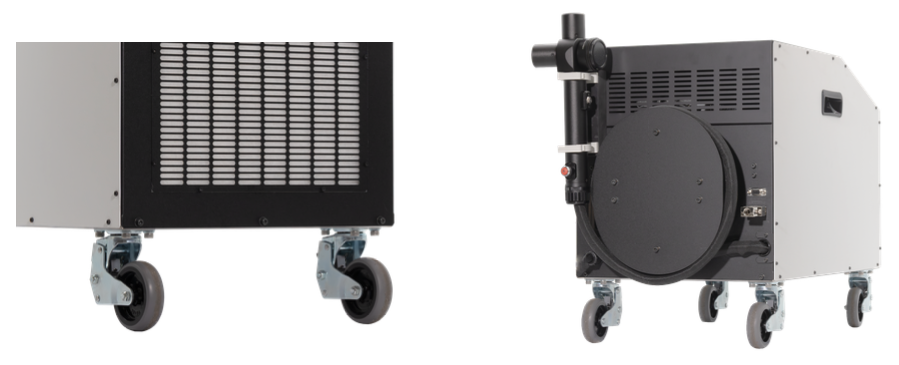 空冷方式を採用したキャスター付きのコンパクトボディにより、優れた可搬性を実現しています。単相100 V・15 Aの商用電源に対応しており、特別な設備を必要とせず、場所を選ばず使用可能です。