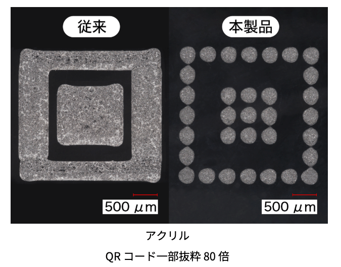 さらに、より高精細な微細加工を実現できるようになりました。微細加工や小型QRコードのように、視認性や読み取り性が求められる用途に対しても、シャープかつコントラストの高いマーキングが可能です。